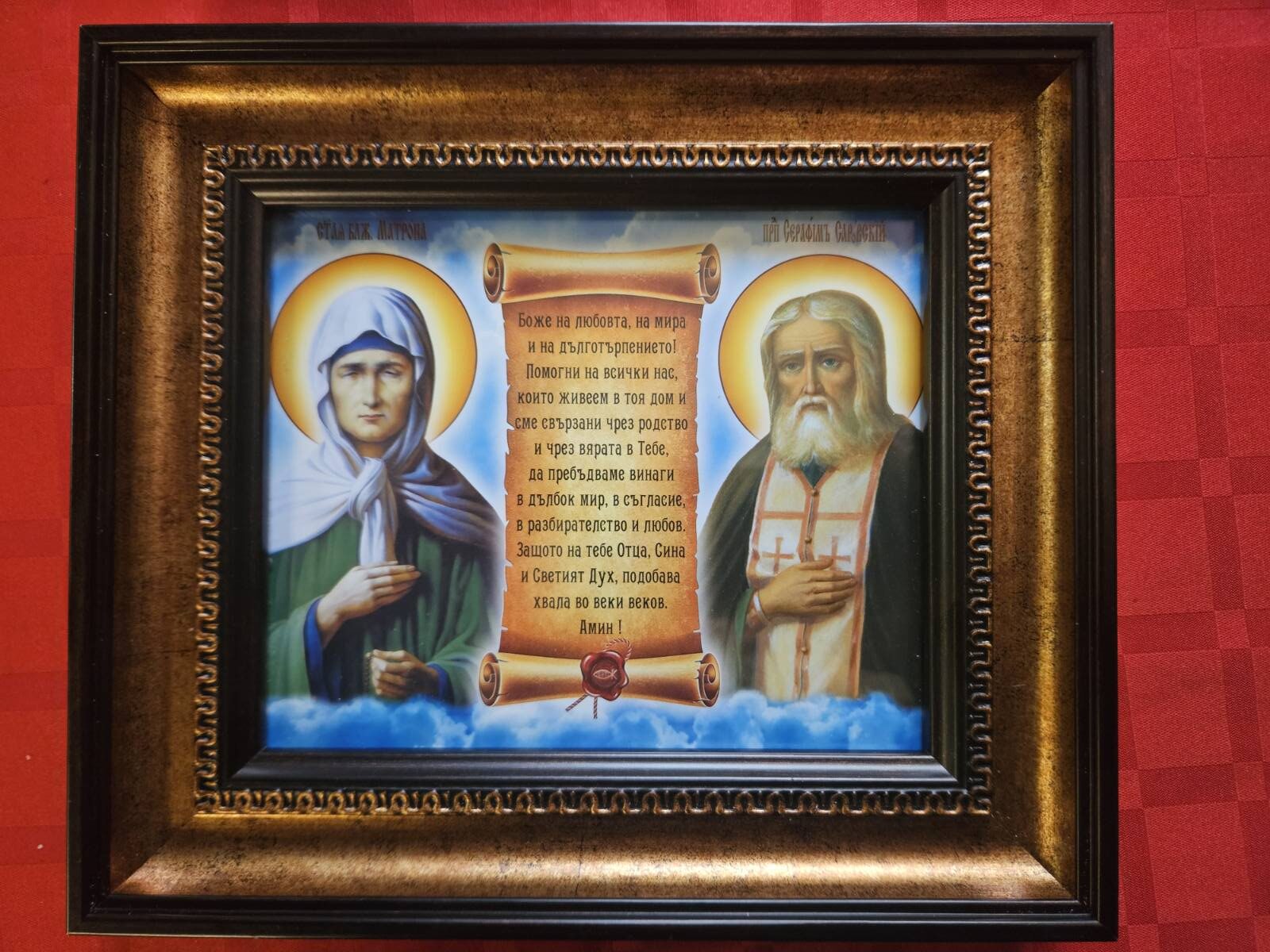Икона „Свети Серафим Саровски и Света Матрона Московска“ с молитва за съхранение от всяко зло. Запазва дома от бедствия, раздори и беди, болести. Кивот, размер 15/18 см., висок клас полиграфия, свободна за износ. Изработка „ИлитоН“